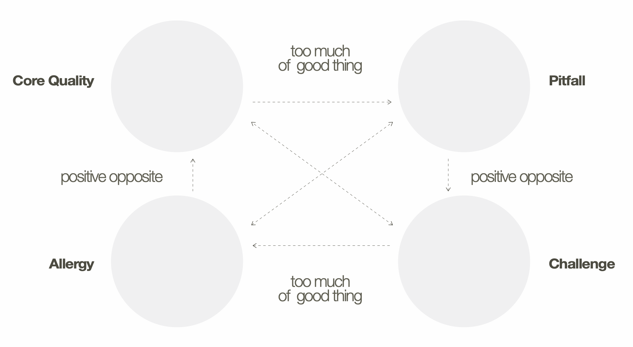 Select a few key qualities and explore them using the Core Qualities Quadrant logic. For each quality, reflect on how it can become a “pitfall” when overused, what complementary “challenge” could balance it, and what “allergy” or tension might arise in relation to other team members.